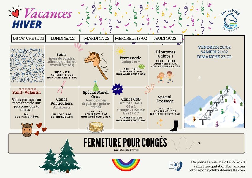 Le Val de Vire est une structure familiale à échelle humaine. Les cours y sont dispensés en petits groupes, la cavalerie est dressée et choisie scrupuleusement. Les moniteurs sont soucieux de transmettre l'amour du cheval autant que la technique equestre. Il est important de prendre en compte le bien être animal et d'apprendre à nos cavaliers à entrer en contact avec les équidés de façon respectueuse en sachant comment ils vivent, comment ils réflechissent , comment ils réagissent ...ce qu'ils peuvent faire et ne pas faire.